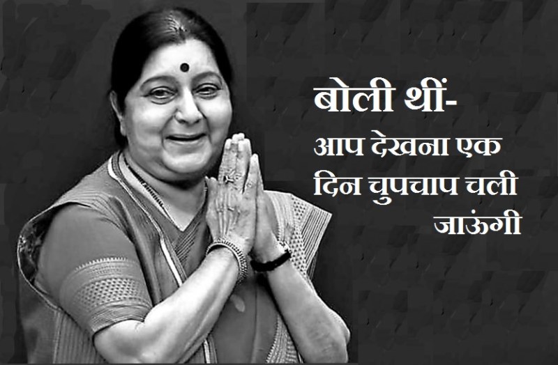 यही भाव उन्होंने पीएसके के उद्घाटन अवसर पर दिखाया। करीब आधा घंटा उनके साथ रहा। सुषमा स्वराज ( Sushma Swaraj ) ने हल्की मुस्कुराहट के साथ धीमे से कहा, मैं इसी तरह जीना पसंद करती हूं, देखना एक दिन इसी तरह से चुपचाप चली भी जाऊंगी। 'पत्रिका' को लेकर बोला, यह तो अपना अखबार है। लोगों की आवाज बनता है। उन्होंने यह भी कहा कि आपके प्रधान संपादक गुलाब कोठारी को भी बोलना, 'पत्रिका के अभियान को मैंने परिणाम तक ला दिया। - राजेश कसेरा
