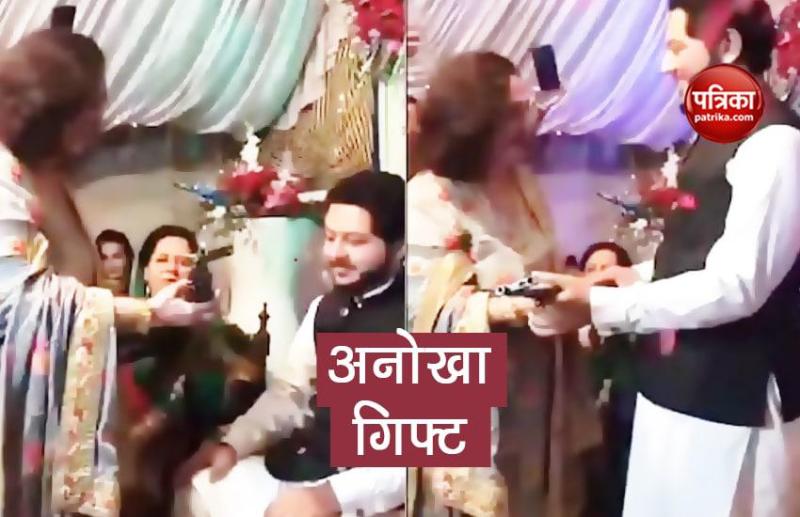 नई दिल्ली। शादी में आने वाले मेहमान दूल्हा और दुल्हन के लिए कोई ना कोई गिफ्ट जरूर लेकर आते है। कुछ लोग लिफाफे में पैसे डालकर भी देते है। वहीं करीबी लोग दूल्हा और दुल्हन को महंगे खास उपहार देते है। कई बार लोगों को ऐसे गिफ्ट भी मिल जाते है जिसके बारे में उन्होंने कभी सोचा भी नहीं होता है। एक वीडियो सोशल मीडिया पर खूब वायरल हो रहा है। इस वीडियो में एक महिला दूल्हे को गिफ्ट में एके-47 राइफल दे रही है। यह वीडियो अपने पड़ोसी देश पाकिस्तान का बताया जा रहा है। हालांकि यह वीडियो पुराना है लेकिन ए बार फिर यह वायरल हो रहा है।