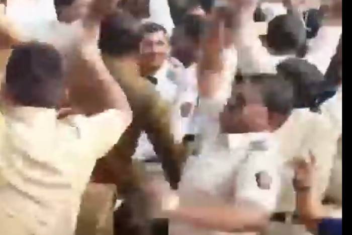 वीडियो में दिखाया जा रहा है कि पुलिस वाले यूपी को अखिलेश पसंद हैं गाने पर डांस कर रहे हैं। यहां डांस करने वाले इस शख्स की टीशर्ट पर महाराष्ट्र राज्य लिखा हुआ है।