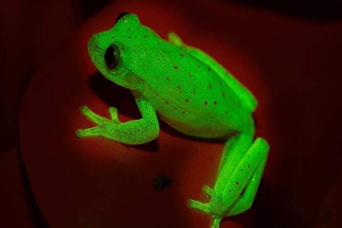 ज्यादातर पेड़ों पर रहने वाले इन मेंढकों पर जब शोधकतार्ओं ने पराबैंगनी किरणों से युक्त एक फ्लैशलाइट से इस मेंढक पर रोशनी फेंकी, तो लाल की जगह उनके अंदर से गहरे हरे और नीले रंग का प्रकाश परावर्तित होने लगा।