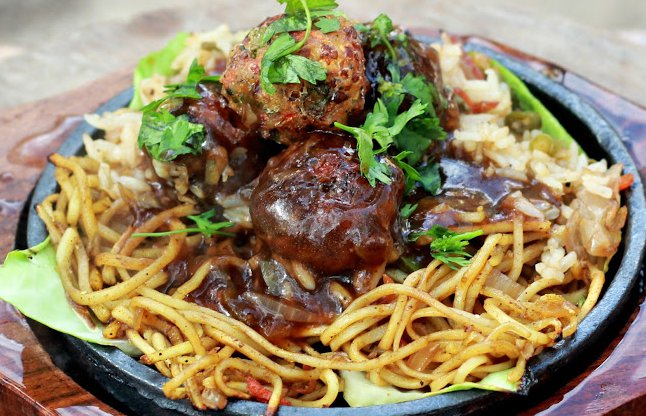 एक बाउल में थोड़ा मैदा, कॉर्नफ्लोर, चुटकीभर रंग, थोड़ी कालीमिर्च, नमक डालकर इसका पेस्ट बनाएं। इसमें पनीर के टुकड़े डिप कर तेल में फ्राई करें। एक प्लेट में उबले आलू लेकर उसमें एक चम्मच कॉर्नफ्लोर व मैदा, नमक, कालीमिर्च मिलाकर मिक्स करें। छोटी लोई बनाकर तलें। फिर अलग पैन में दो चम्मच तेल डालकर लहसुन-अदरक डालें। सब्जियों को काटकर डालें व पकाएं। इसमें कालीमिर्च, नमक, सोया सॉस, सिरका डालकर गाढ़ा होने तक पकाएं। दूसरी तरफ सिजलर ट्रे को अच्छे से गर्म कर इसमें पत्तागोभी के पत्ते बिछाएं। इसपर पनीर व आलू के फ्राई टुकड़े रख दें। साथ में डीप फ्राई की गई और उबली चाउमीन डालने के बाद ग्रेवी डालकर गर्मागर्म सर्व करें।