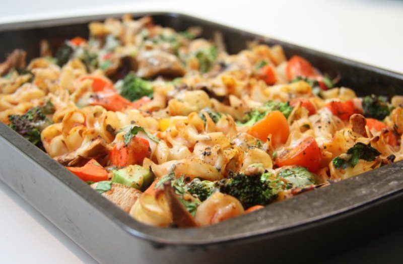 पास्ता और चीज सॉस को एक चौड़े नॉन-स्टिक पॅन में अच्छी तरह मिला लें। परोसने की प्लेट में निकालकर, उपर और बीच के भाग में रोस्टड वेजिटेबल्स डालें और अंत में इसके उपर चीज डालें। तुरंत परोसें।