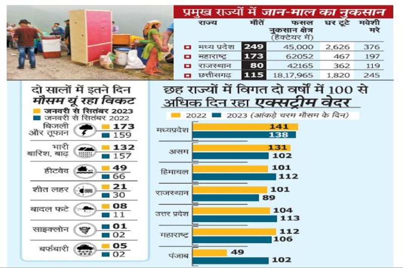 रिपोर्ट में कहा गया है कि इस अवधि में 2,923 लोगों की मृत्यु हो गई, 18 लाख 40 हजार हेक्टेयर क्षेत्र में खड़ी फसल बर्बाद हो गई, 80563 हजार घर तबाह हो गए और 92519 मवेशी मारे गए। रिपोर्ट के अनुसार चरम मौसम स्थितियों के कारण मृत्यु के सर्वाधिक मामले बिहार (642), हिमाचल प्रदेश (365) और उत्तर प्रदेश (341) में दर्ज किए गए। हिमाचल प्रदेश में सबसे अधिक 15407 घर नष्ट हुए और पंजाब में सबसे अधिक 63649 जानवरों की मौत हो गई। जबकि तेलंगाना में फसल नष्ट होने का क्षेत्रफल सबसे अधिक रहा।