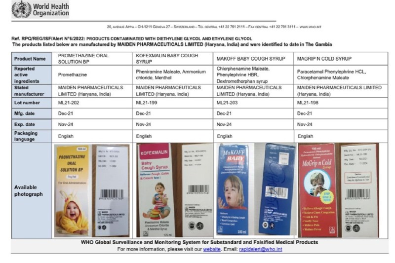 विश्व स्वास्थ्य संगठन ने भारत में बनी जिन चार खांसी की सीरप के बारे में अलर्ट जारी कर उनको जानलेवा बताया है उनके बारे में अब भारत सरकार ने भी जांच शुरू कर दी है। ये चारों दवा मैडेन फार्मास्यूटिकल्स की हैं, जिसका ऑफिस हरियाणा के सोनीपत में स्थित है..। केंद्रीय औषधि मानक नियंत्रण संगठन (CDSCO) ने इस बात की जानकारी दी है कि विश्व स्वास्थ्य संगठन की ओर से भारत में निर्मित 4 कफ सिरप के खिलाफ अलर्ट जारी करने के बाद जांच के आदेश दे दिए गए हैं। गौरतलब है कि अफ्रीकी देश गाम्बिया में 66 बच्चों की मौत के मामले में भारत में निर्मित इन 4 कप सिरप को संभावित जिम्मेदार माना जा रहा है।