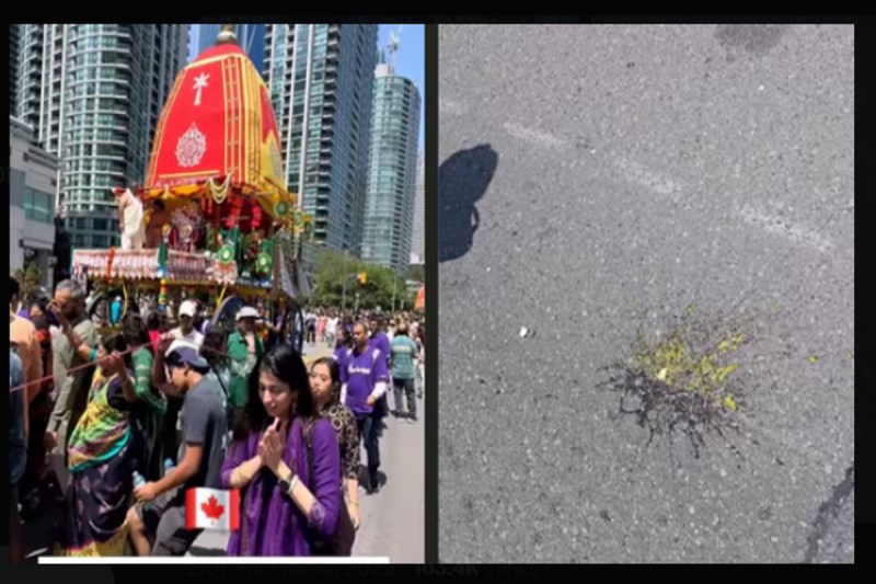 इस घटना का वीडियो टोरंटो निवासी सांगना बजाज ने रविवार को इंस्टाग्राम पर साझा किया था। वीडियो में वह भजन-कीर्तन करती दिखाई देती हैं। जैसे ही रथयात्रा कम भीड़ वाले इलाके में पहुंचती है, सड़क पर टूटे अंडे बिखरे नजर आते हैं।