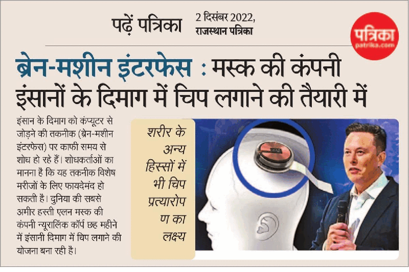 दुनिया के सबसे अमीर आदमी व टेस्ला, स्पेसएक्स व ट्विटर के मालिक एलन मस्क इंसानों के दिमाग में लगाने के लिए चिप बना रहे हैं। यह चिप एलन मस्क की कंपनी न्यूरालिंक तैयार कर रही है, जो अगले 6 महीने के अंदर इंसानी दिमाग में चिप लगाकर ट्रायल शुरू करने वाली है। एलन मस्क ने कहा कि कंपनी को मानव मस्तिष्क में डिवाइस लगाने से पहले बेहद सावधान रहना होगा। इसके साथ ही उन्होंने कहा कि पहले इंसानी दिमाग में चिप लगाने के लिए कड़ी मेहनत कर रहे हैं।