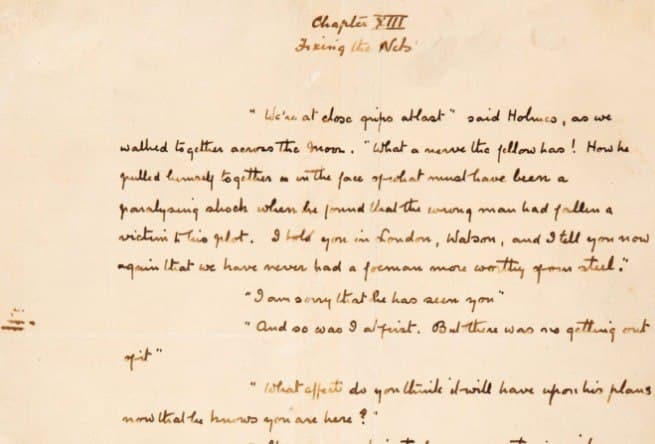 आठ साल पहले फिक्शनल डिटेक्टिव के मारे जाने के बाद सर आर्थर कॉनन डॉयल ने 1902 के उपन्यास में शेरलॉक होम्स के कैरेक्टर को फिर से जिंदा किया था। यह पेज द हाउंड ऑफ़ द बास्करविल्स की मूल स्क्रिप्ट के 185 पृष्ठों में से एक है। ज्यादातर पेज समय के साथ नष्ट हो गए क्योंकि डॉयल ने एसिडिक पेपर पर लिखा था। आज सिर्फ 37 पेज ही मौजूद हैं।