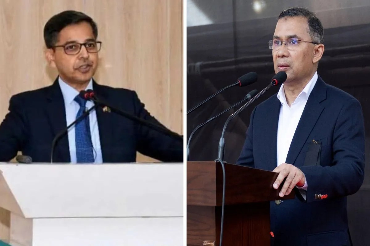 बांग्लादेश में तैनात भारत के हाई कमिश्नर प्रणय वर्मा और पीएम तारिक रहमान। (फोटो- ANI)