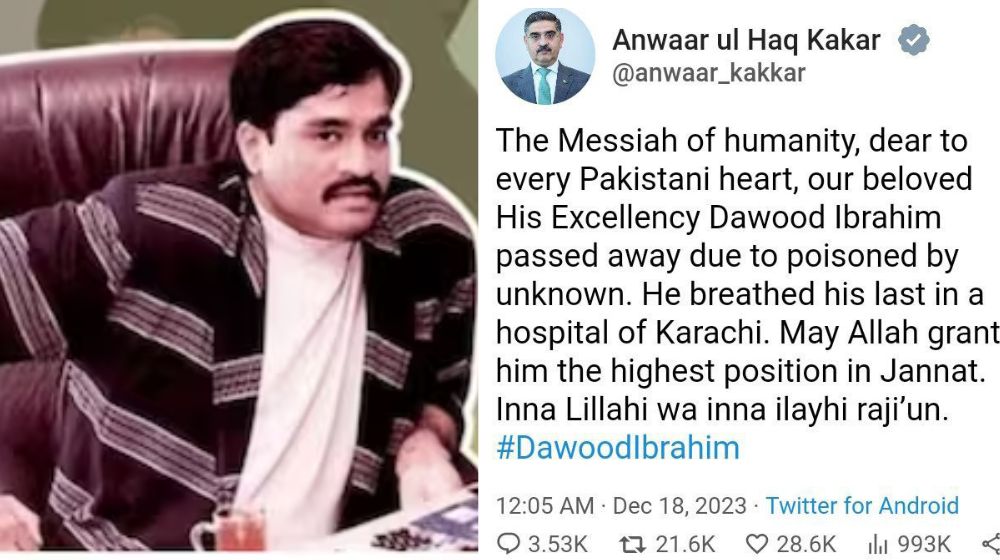 बता दें कि मुंबई हमलों का मास्टर माइंड और भारत के मोस्ट वॉन्टेड आतंकी दाऊद इब्राहिम के मारे जाने पर पाकिस्तान के कार्यवाहक प्रधानमंत्री अनवर-उल-हक काकर ने एक्स पर पोस्ट कर लिखा कि मानवता के मसीहा, हर पाकिस्तानी दिल अजीज, हमारे चहेते दाऊद इब्राहिम का अज्ञात जहर खाने से निधन हो गया। उन्होंने कराची के एक अस्पताल में आखिरी सांस ली। अल्लाह उन्हें जन्नत में आला मकाम अता करें। हालांकि उन्होंने बाद में अपना ये पोस्ट डिलीट कर दिया है। वहीं, पाकिस्तान के कई शहरों में कल रात से ही इंटरनेट पर पाबंदी लगा दी गई है।