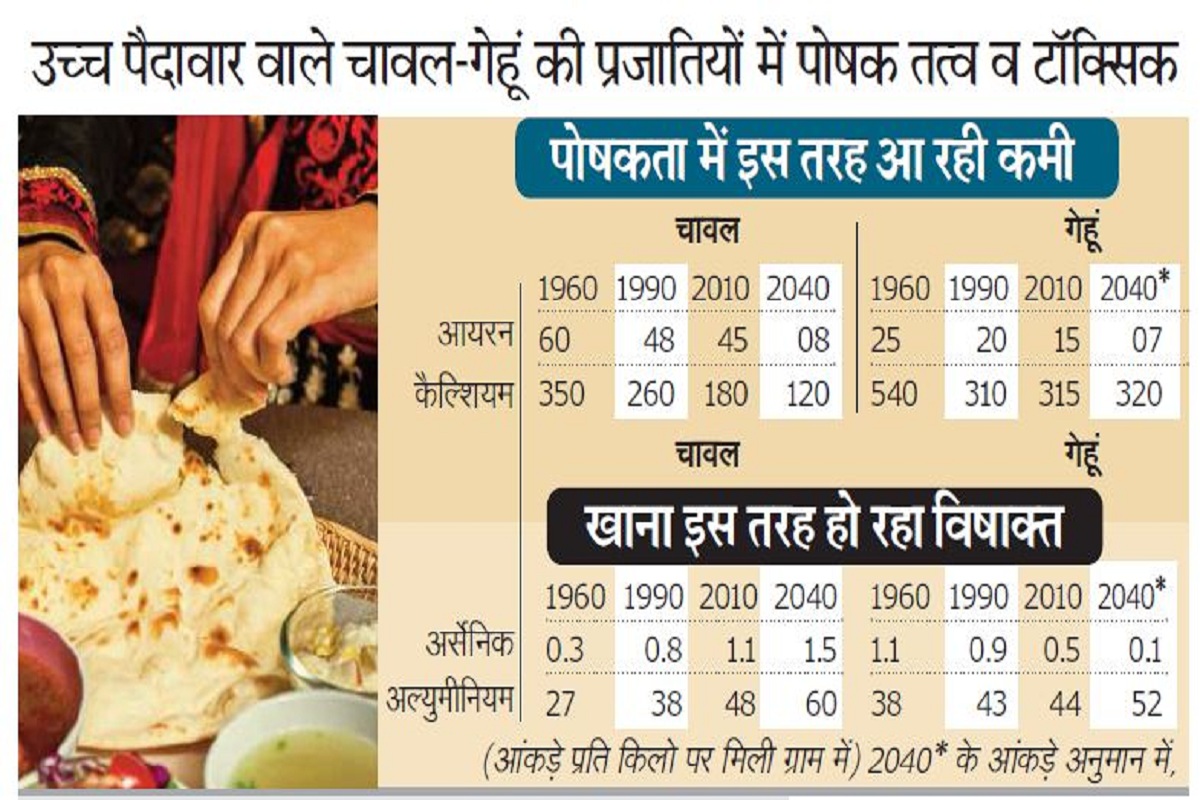 हरित क्रांति ने हमारी थाली में गेहूं और चावल की पर्याप्त मात्रा जरूर पहुंचा दी है, पर इसके लिए गेहूं और चावल की जो नई प्रजातियां विकसित की गईं, उसमें अनाजों में जरूरी पोषक तत्वों की मात्रा कम हो रही है। इंडियन काउंसिल ऑफ एग्रीकल्चरल रिसर्च (आइसीएआर) और विधान चंद्र कृषि विश्वविद्यालय, पश्चिम बंगाल तथा नेशनल इंस्टीट्यूट ऑफ न्यूट्रीशन, तेलंगाना के 12 वैज्ञानिकों के संयुक्त अध्ययन में ये दावा किया गया है। जानी-मानी पत्रिका डाउन टू अर्थ में यह अध्ययन तीन श्रृंखला में प्रकाशित है। अध्ययन में दावा किया गया है कि चावल और गेहूं की नई प्रजातियां विकसित करने में सारा जोर उत्पादकता बढ़ाने पर रहा है, पर इस प्रक्रिया गेहूं और चावल में मौजूद पोषक मूल्यों से समझौता किया गया है। अध्ययन में पाया गया है कि भारत के लोगों की 50 फीसदी ऊर्जा जरूरतें गेहूं और चावल के जरिए पूरी होती हैं। अध्ययन के अनुसार, इन दोनों ही अनाजों का पोषक मूल्य पिछले 50 साल में 45 फीसदी तक कम हो गया है, जबकि इनमें मौजूद टॉक्सिक पदार्थ जैसे आर्सेनिक, बोरियम की मात्रा बढ़ती जा रही है। शोधकर्ताओं ने दावा किया है कि अगर ऐसा ही चलता रहा तो 2040 तक इन अनाजों की पोषकता बहुत कम हो जाएगी और ये शरीर को जरूरी पोषकता देने के बजाए हमें रोगी बनाने का काम करेंगे।