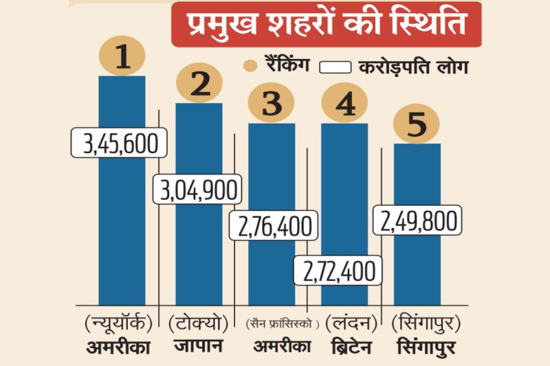 रिपोर्ट के अनुसार विश्व में सबसे ज्यादा करोड़पति न्यूयॉर्क (अमरीका) में रहते हैं। इसके बाद टोक्यो (जापान) दूसरे व सैन फ्रांसिस्को खाड़ी क्षेत्र तीसरे स्थान पर हैं। विश्व में सर्वाधिक करोड़पतियों वाले प्रमुख 20 शहरों की सूची में 6 अमरीकी शहर हैं।