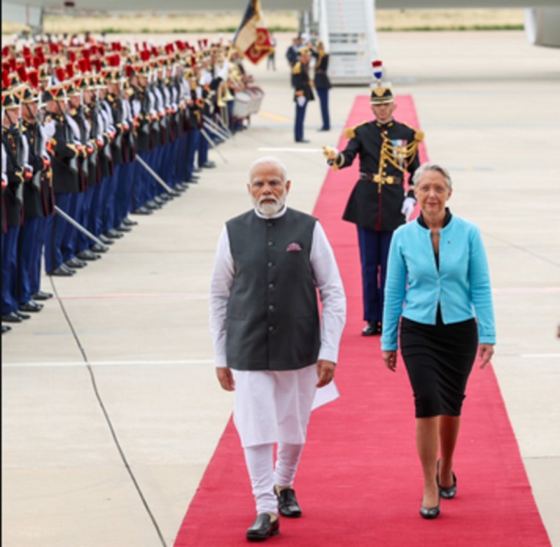 पीएम मोदी जब पेरिस के ओरली एयरपोर्ट पहुंचे, तो वहाँ उन्हें रिसीव करने के लिए फ्रांस की पीएम एलिसाबेथ बोर्न (Elisabeth Bourne) भी मौजूद थी। ओरली एयरपोर्ट पर पीएम मोदी का भव्य स्वागत हुआ। पीएम मोदी को एयरपोर्ट पर गार्ड ऑफ हॉनर भी दिया गया।